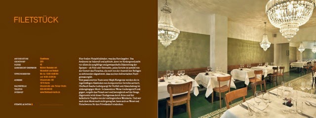 Jedes Restaurant wird im Büchlein mit einer Doppelseite vorgestellt. Dort erfährt man auf einen Blick, welche Art der Küche einen erwartet, wann das Restaurant gegründet wurde, wie viele Plätze es fasst, das Leibgericht des Chefkochs, die Öffnungszeiten, natürlich die Kontaktdaten und einen Tipp für die Anfahrt mit den Öffentlichen Verkehrsmitteln. Außerdem findet sich zu jedem Restaurant ein kleiner beschreibender Text und ein Foto.![]() |